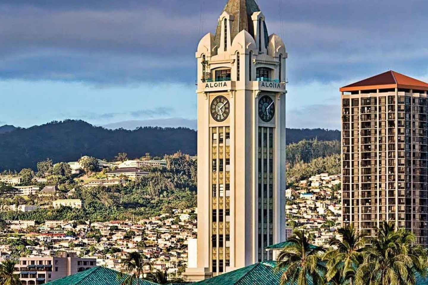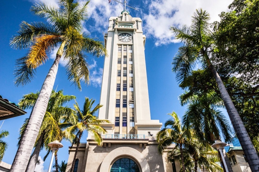 Башня Алоха, построенная в 1926 году и высотой 184 фута, была самым высоким зданием на острове в течение четырех десятилетий, откуда открывался захватывающий вид на гавань. На верхнем этаже находилась обсерватория и смотровая площадка для лоцманов. Его маяк служил ориентиром для навигации, который можно было увидеть с расстояния 15 миль в море, в то время как его часы были одними из крупнейших в Соединенных Штатах. Башня служила гостеприимным маяком для посетителей, когда путешествие в Оаху осуществлялось полностью по морю, «АЛОХА», выгравированная на ее стенах, приветствовала тысячи пассажиров кораблей, входящих в гавань Гонолулу.