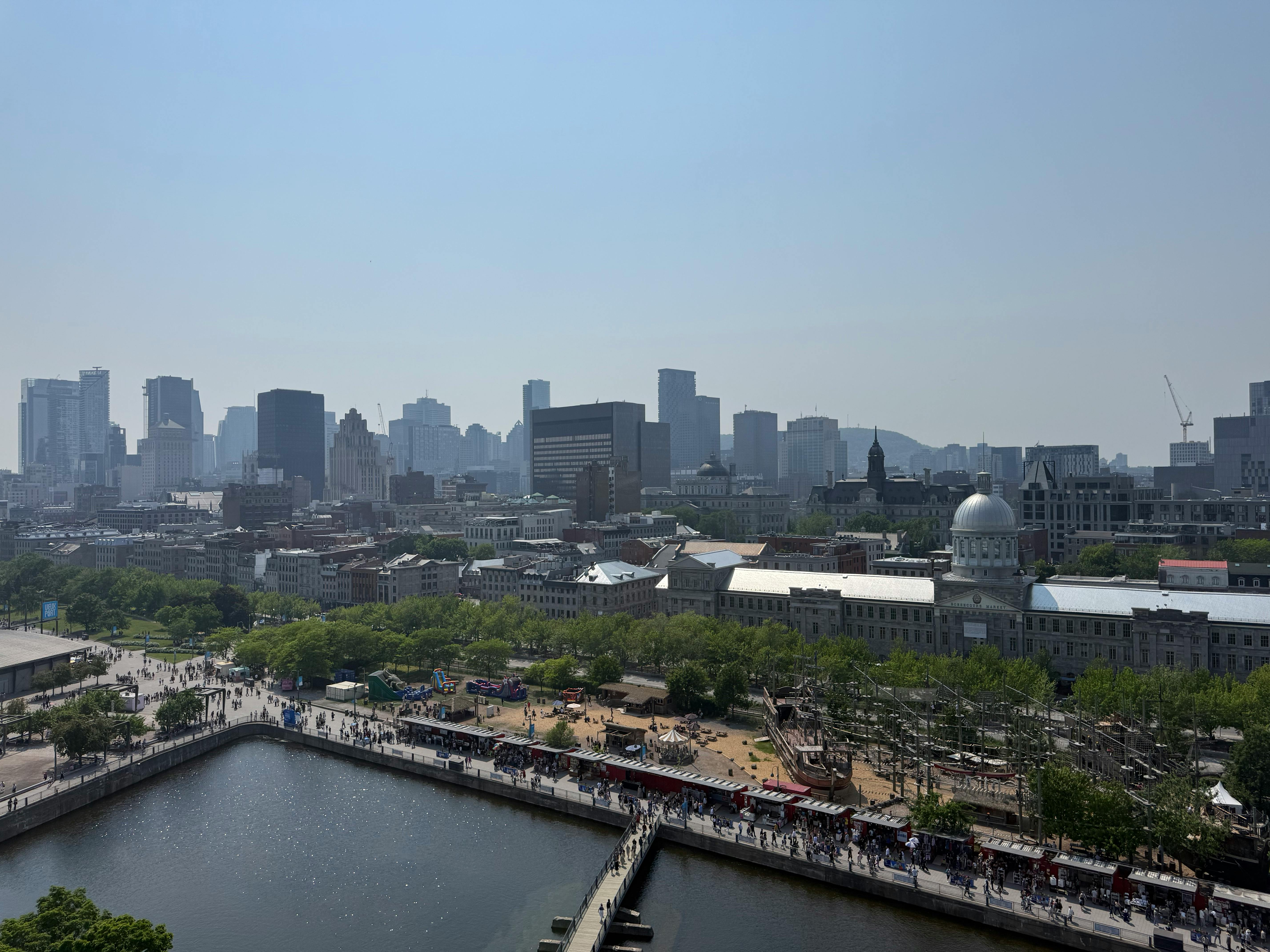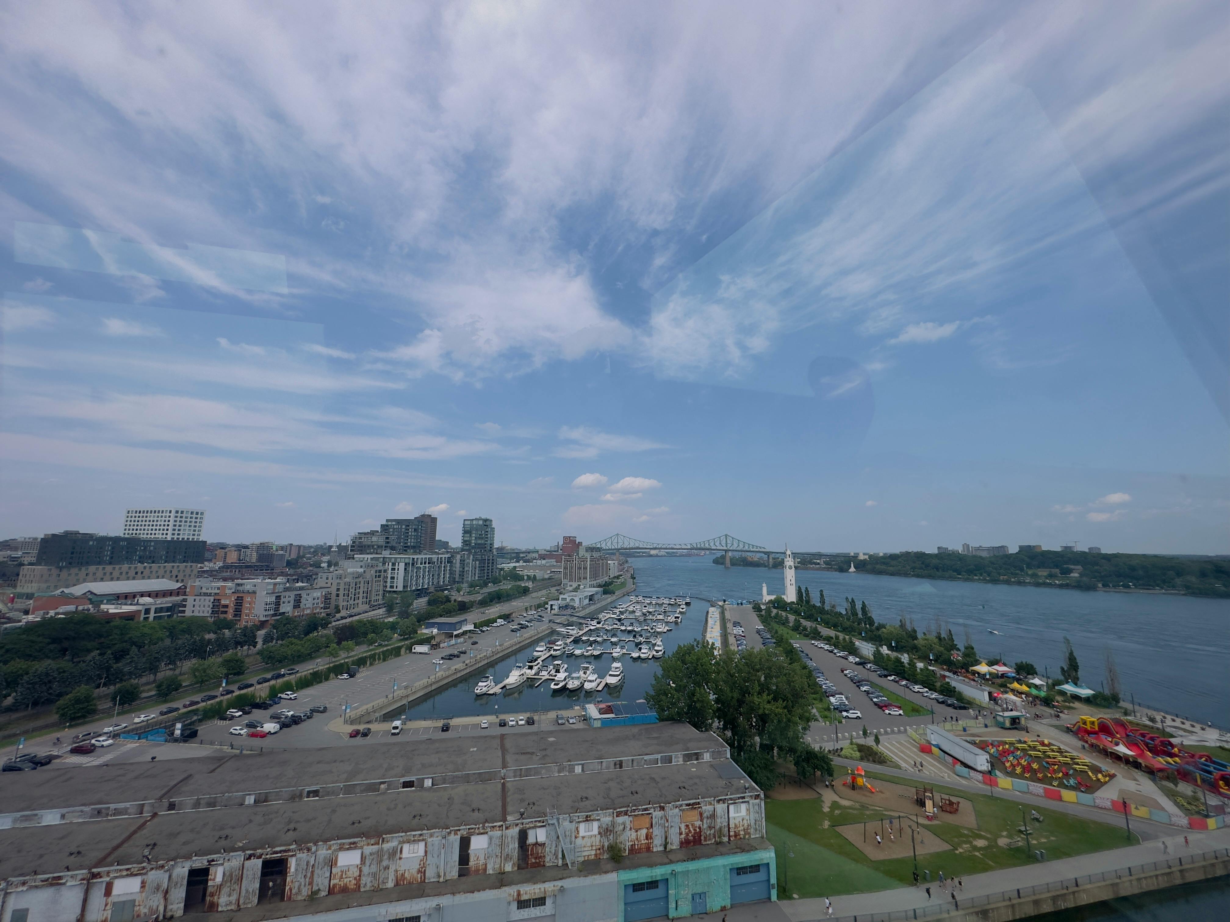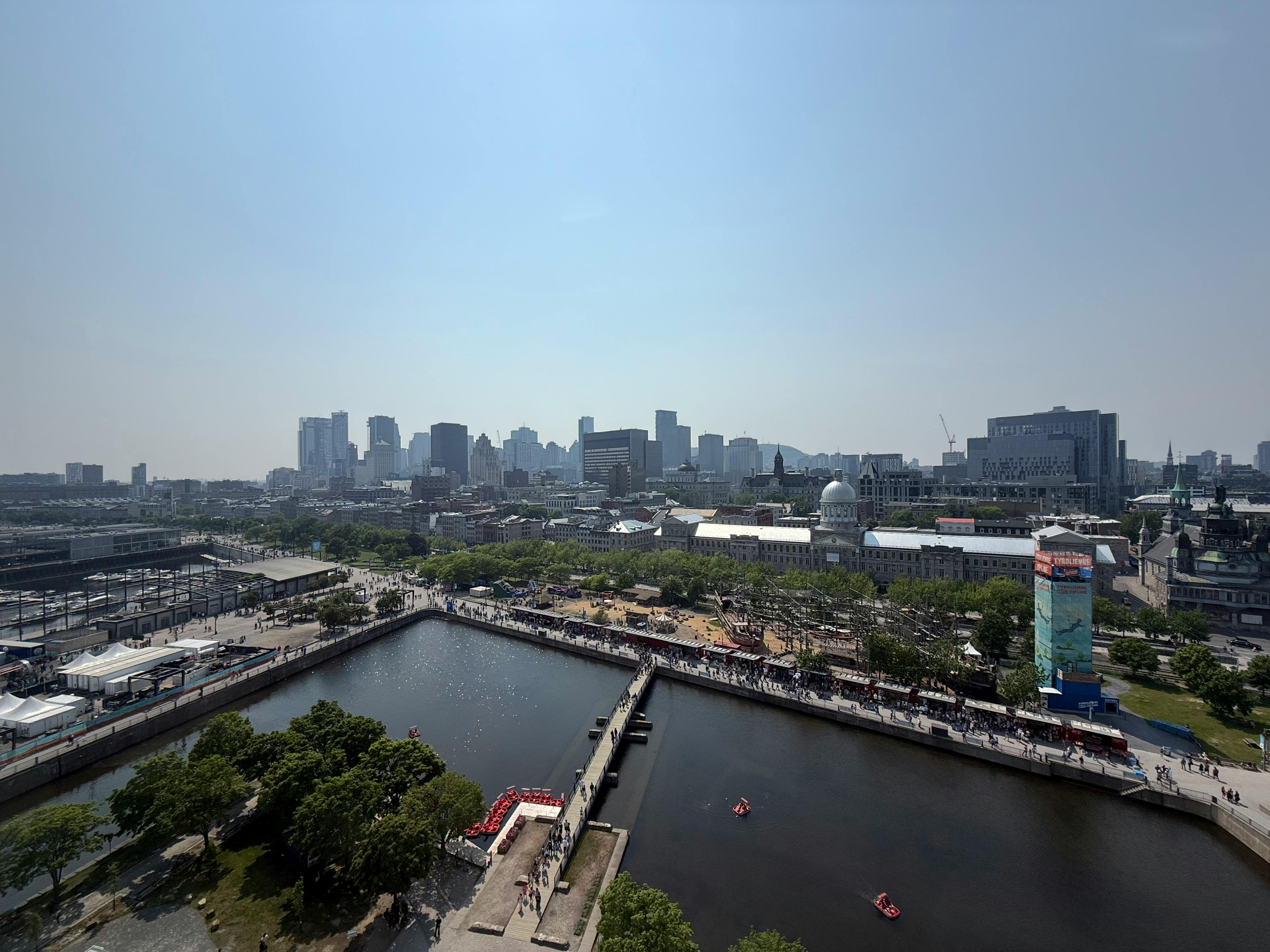 Увеличьте масштаб до 1200 футов от городских достопримечательностей, высоко над Старым портом Монреаля
