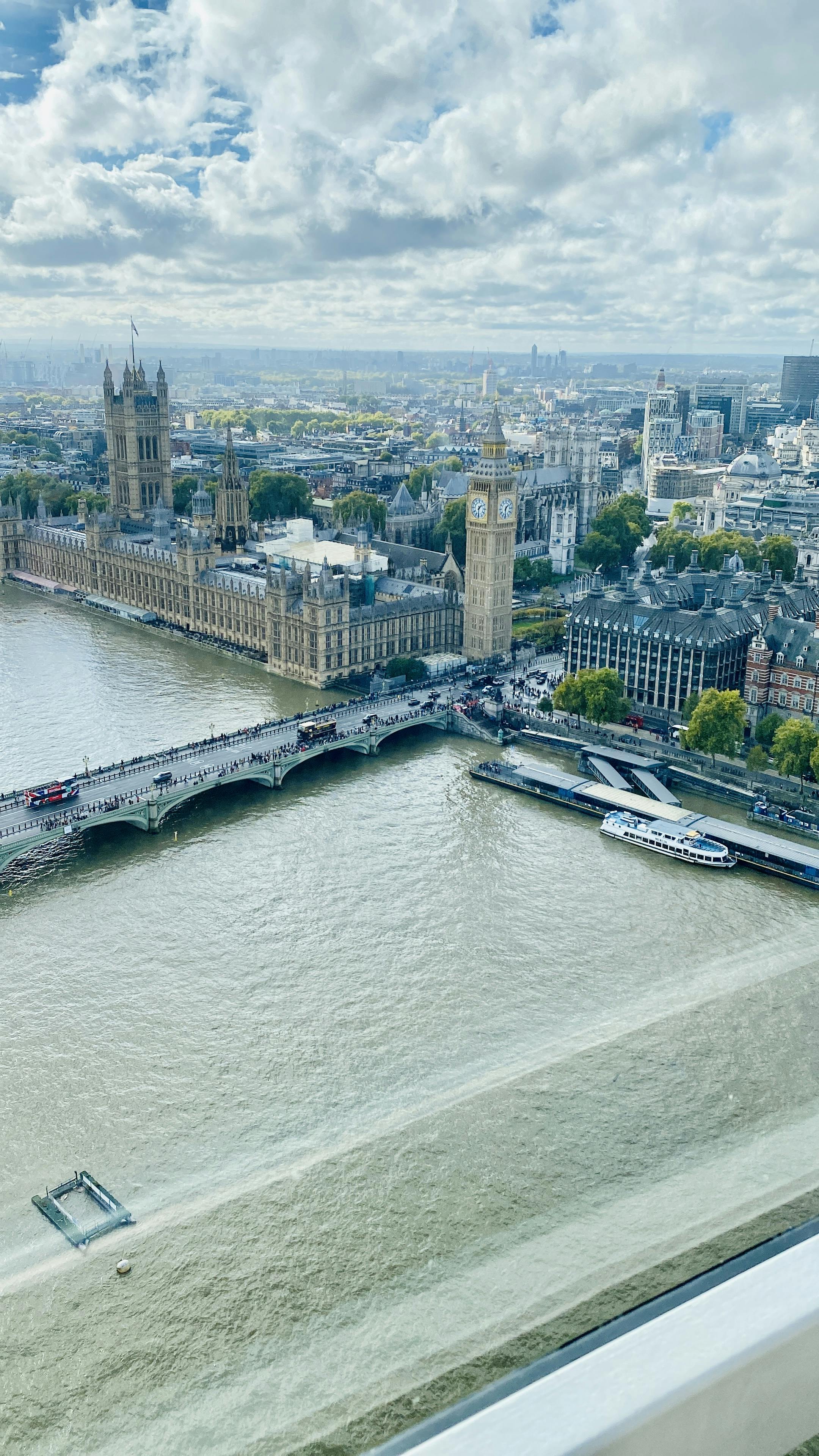 From the top of the London Eye, you can see the River Thames below, Big Ben, House of Parliament, several bridges and gardens, and as far as Windsor Castle on a clear day