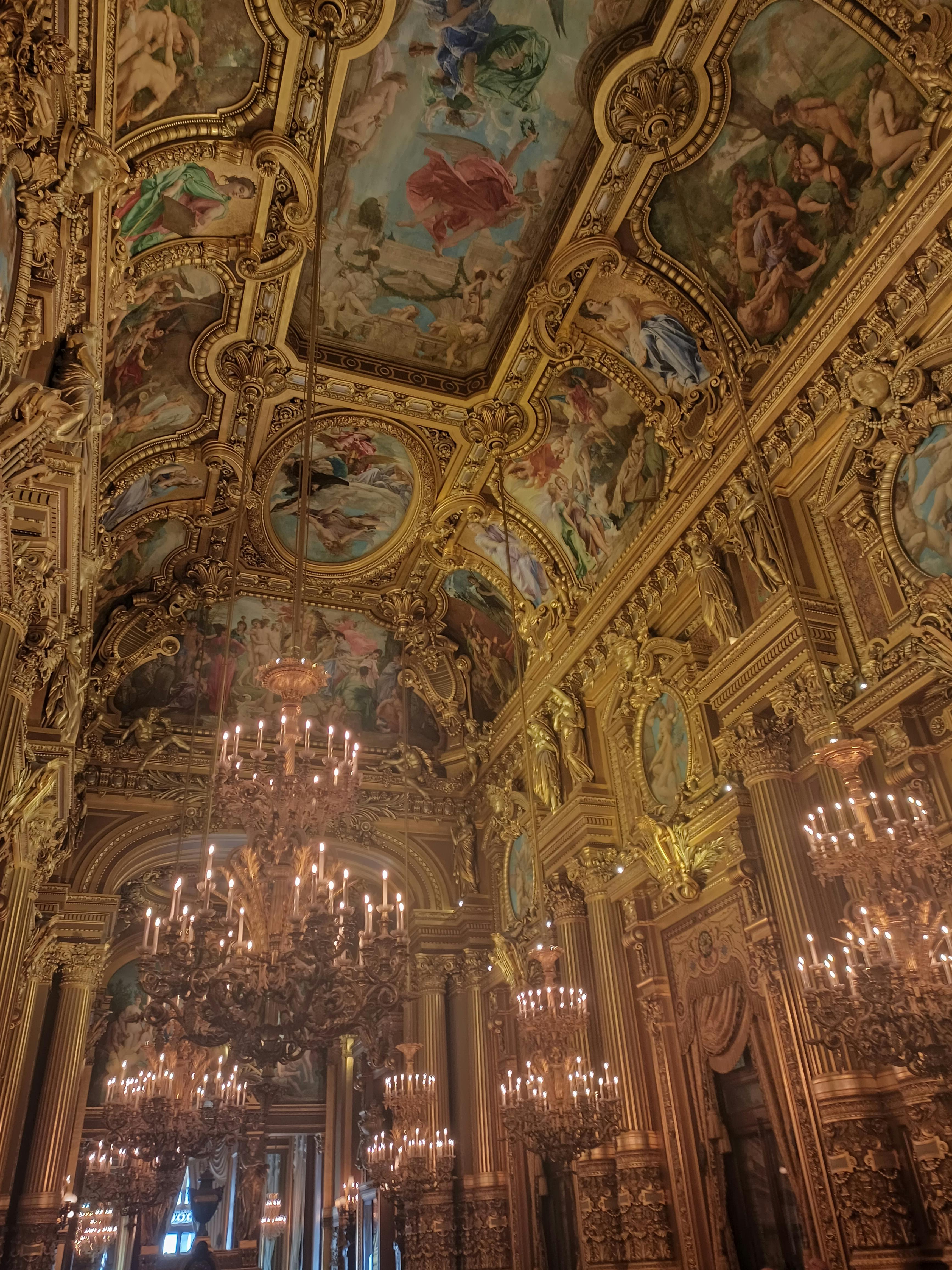 Большое фойе, вдохновленное Зеркальным залом Версаля, представляет собой длинную богато украшенную галерею с позолотой, хрустальными люстрами и картинами о музыке и искусстве Поля Бодри.