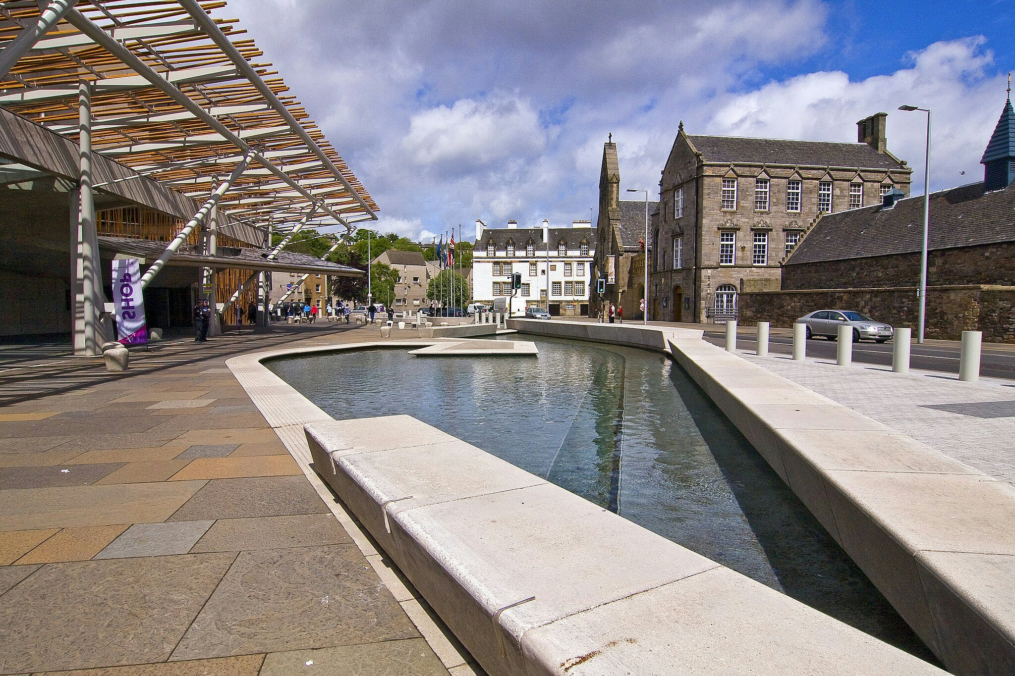 Сцена на открытом воздухе с современным зданием, каменным тротуаром и прямоугольной водой. Исторические здания и фонарные столбы на заднем плане.