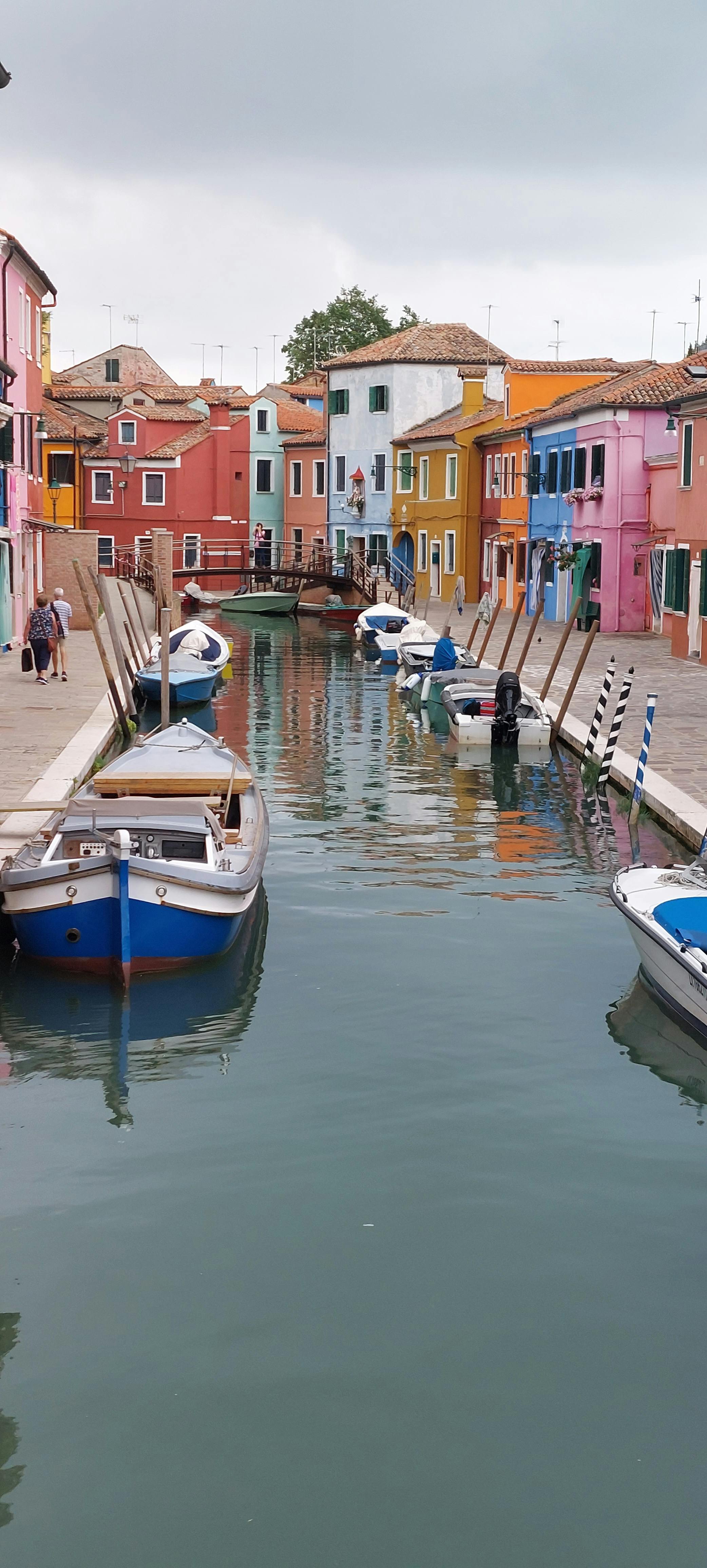 Красочная лодка стояла у канала рядом со зданиями и тротуаром с деревьями, гуляющими людьми и отражениями в воде.