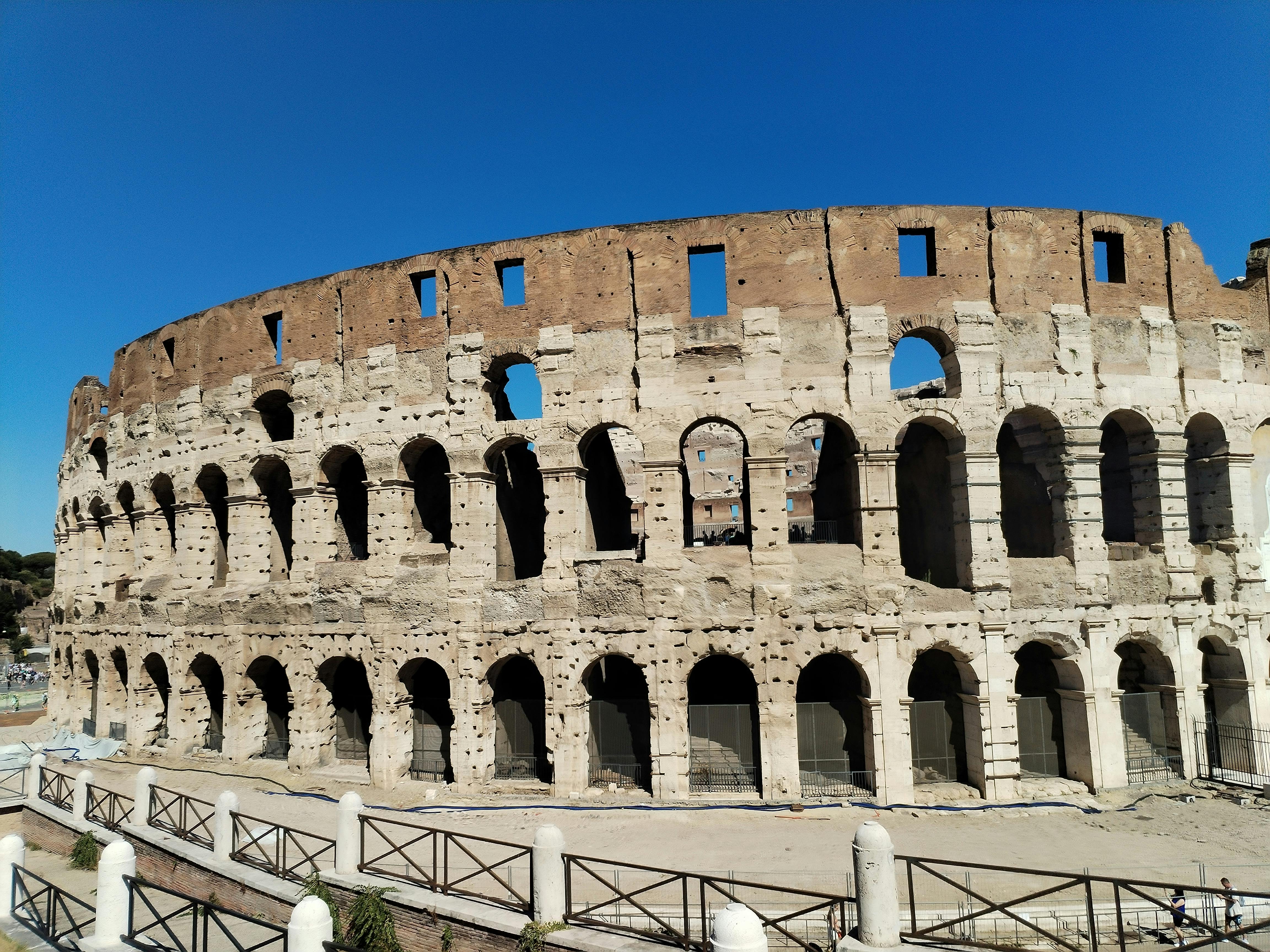 Древний Колизей и Арка Константина в Риме, с зеленой травой и разбросанными посетителями под ясным голубым небом.