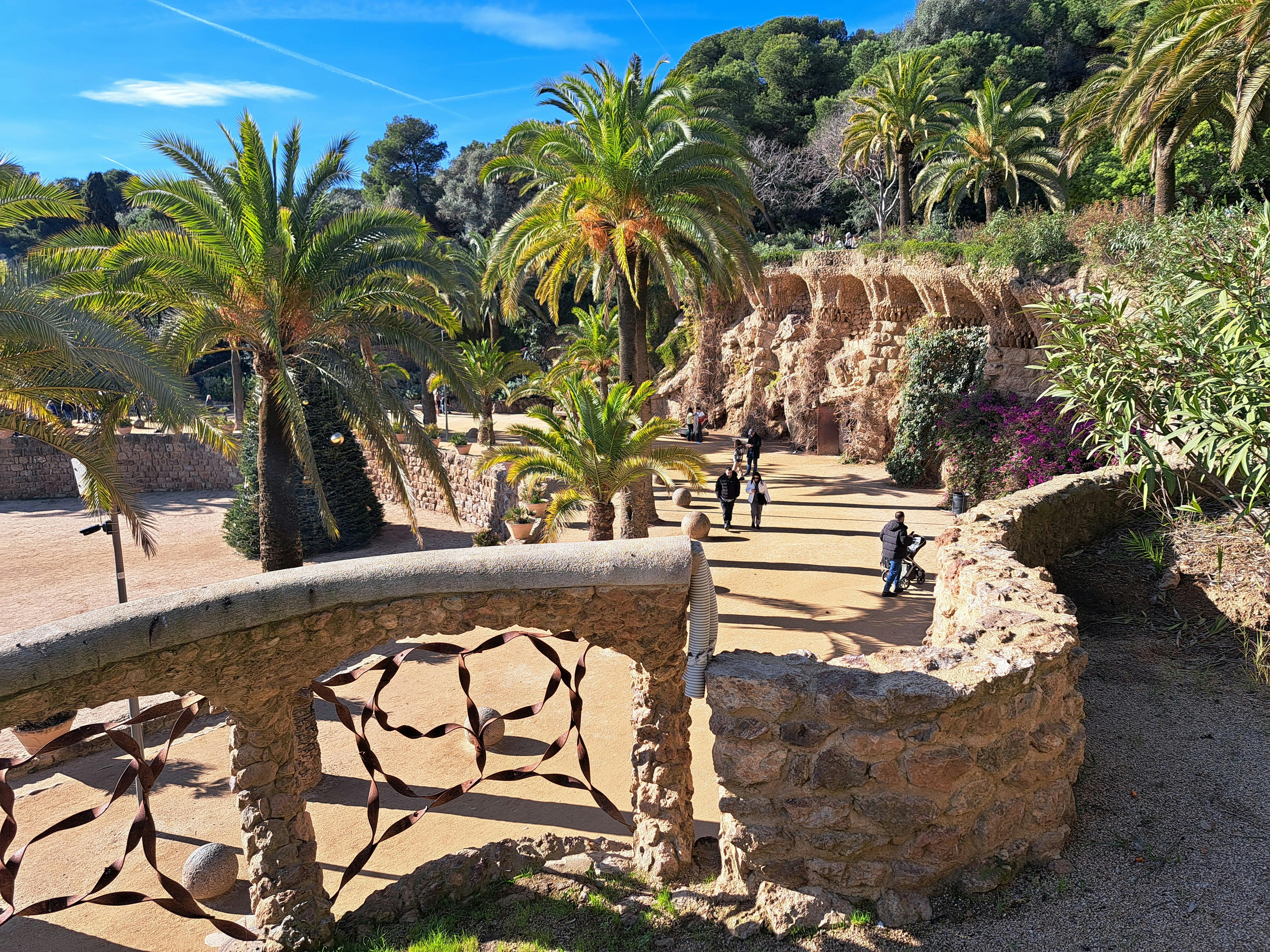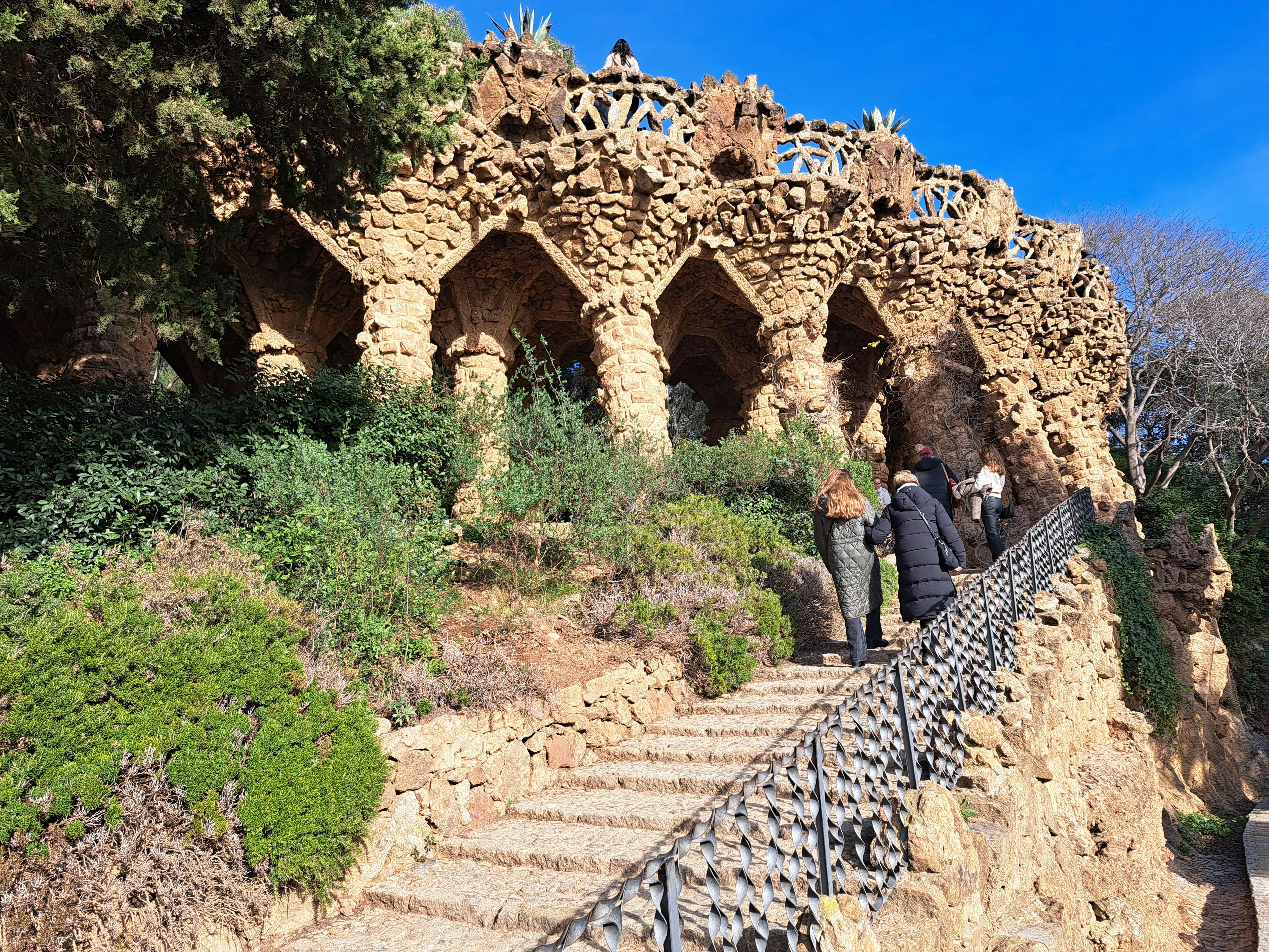 Utanför Monumental Zone kan du spendera mer tid i den större offentliga parken utan biljett. Här kan du följa slingrande smutsvägar genom tallskog i Medelhavet och låg skrubb. Gaudís stenviadukter bär gångvägar ovanför dig, med grova pelare och valv som smälter in i bergssluttningen. Du kan gå under dem eller längs topparna som upphöjda stigar.
