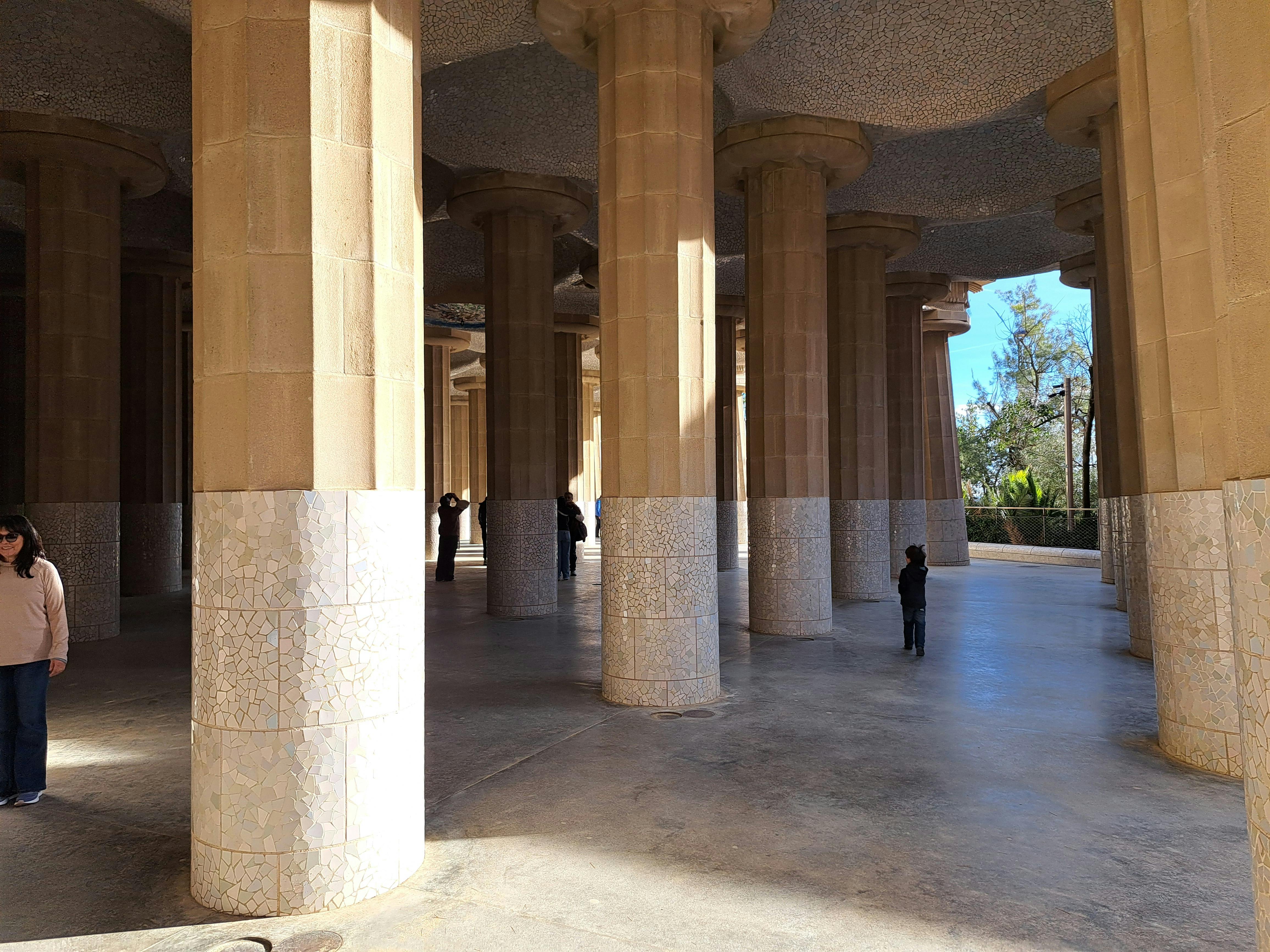 I mitten möter du "El Drac", mosaiksalamandern som har blivit en symbol för Barcelona. Dess vågar är gjorda av trasig keramik, glas och kakel, med Gaudís trencadís teknik. Du ser rika blå, gröna, apelsiner och gula under solljuset. Det här är din första närmare titt på den lekfulla sidan av Gaudís design, precis vid parkens ytterdörr.