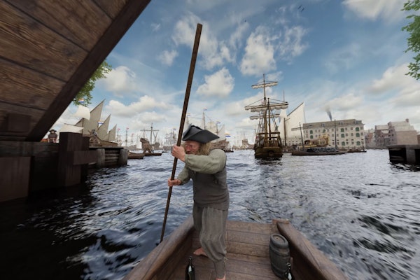 体验17世纪的阿姆斯特丹,船只停泊在港口,商人进行货物贸易,运河正在建设中。 观看阿姆斯特丹的历史发展。