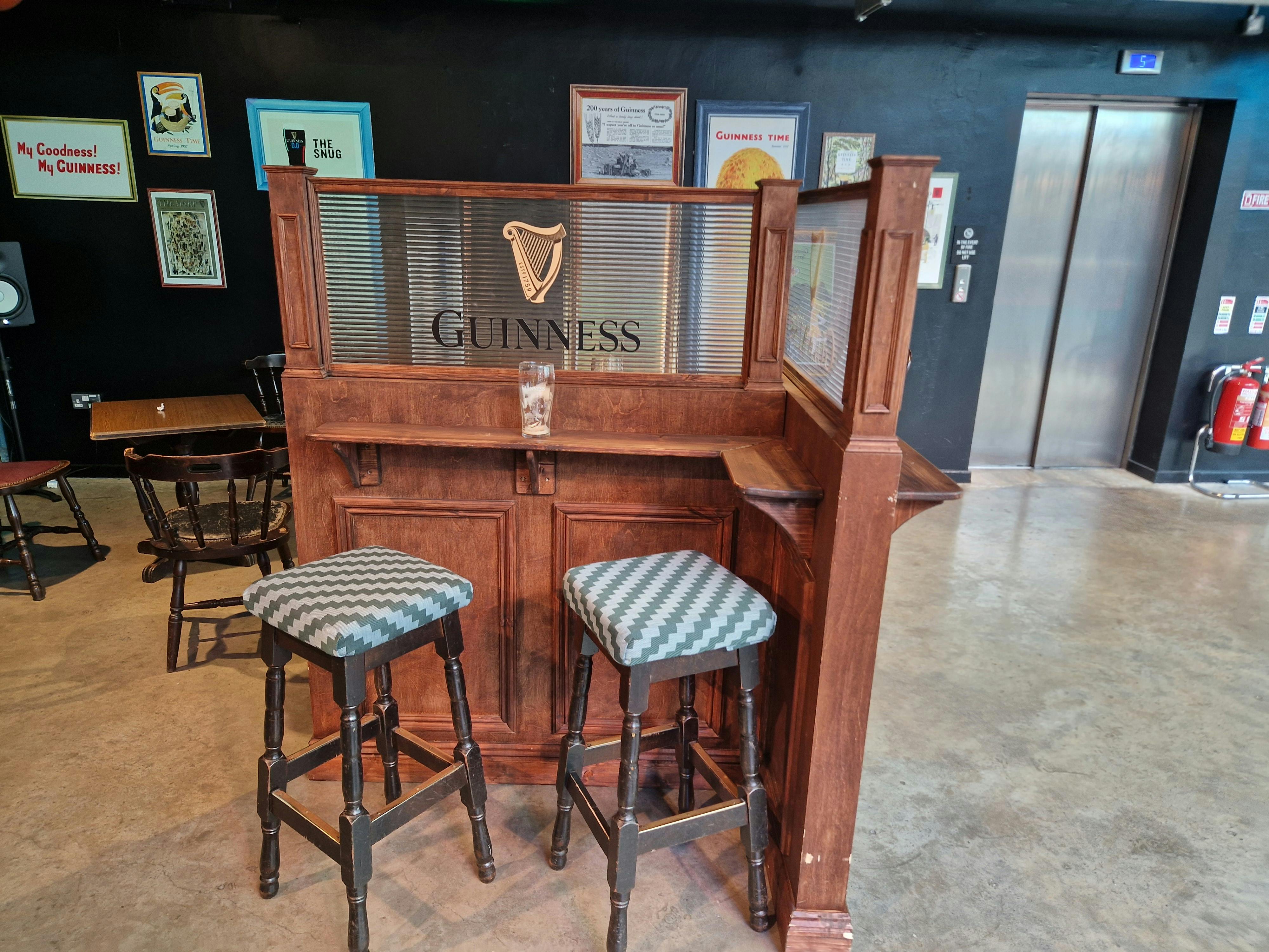 酒吧台面上排列着四品脱奶油头的吉尼斯啤酒,徽标清晰可见。