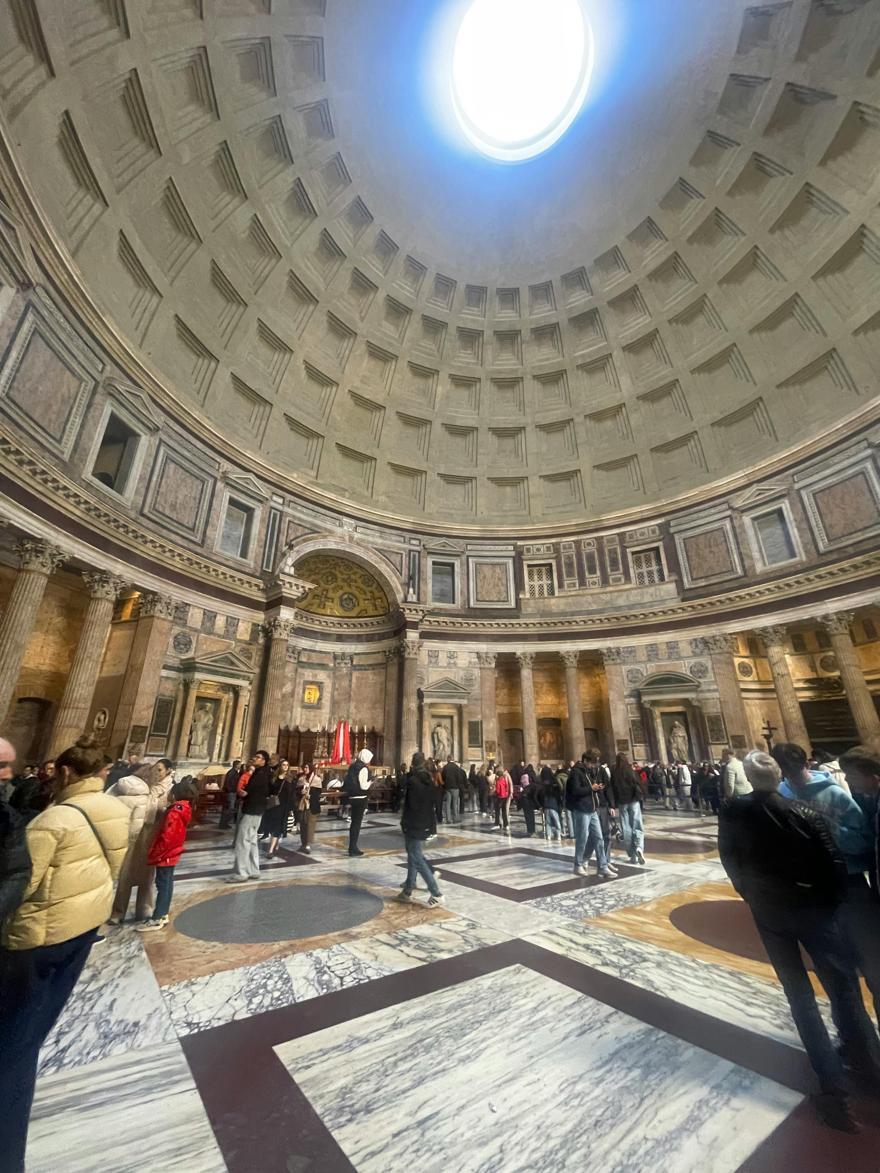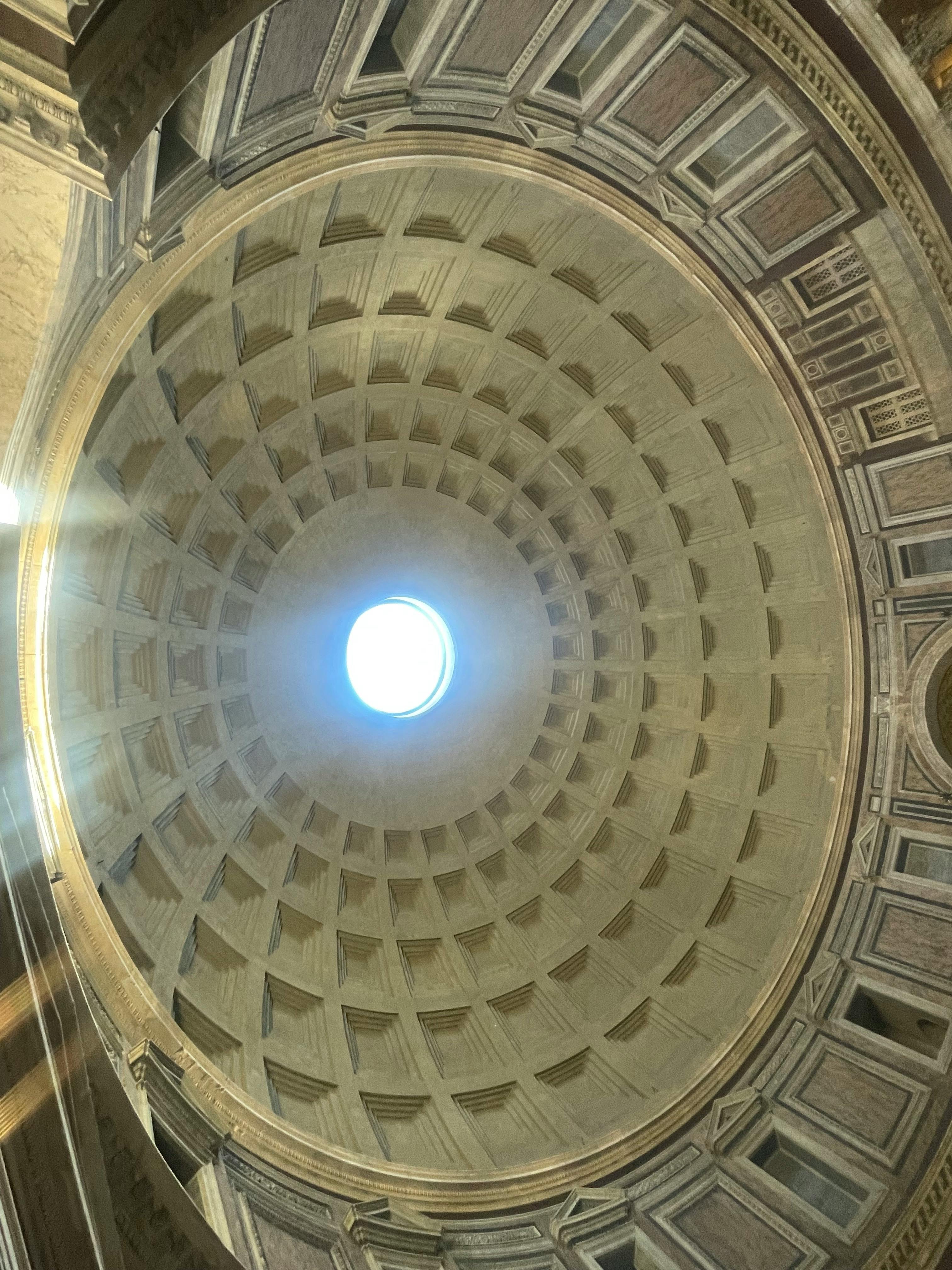 被认为是世界上最美丽的拱形天花板之一,其拼接的凹陷立方体图案环绕着一个九米长的洞-被称为眼睛-直接在圆顶的中心。 该孔具有多种功能,首先它有助于缓解圆顶最薄弱部分的结构张力。 它还让空间充满自然光,并在广场上制作可爱的移动阴影图案。
