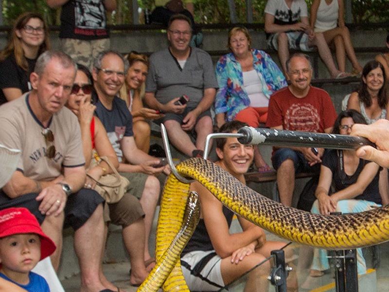 从凯恩斯(Cairns)出发到达公园后,您将自行游览,观看激动人心的喂食表演,乘船巡游在充满鳄鱼的湿地水域中,与考拉亲近等等。